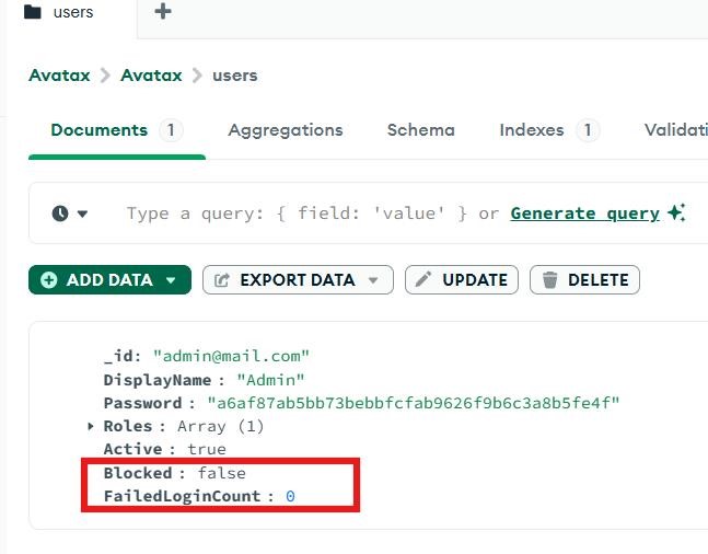 4. Manually change the fields "Blocked" (from "true" to "false") and "FaildLoginCount" (from "3" to "0"), they must look like this: