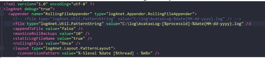 - If you prefer to generate a separate log file for each process, you can edit the log4net.config file:comment line 4 and uncomment line 5 as shown below.